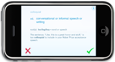 Aplicatia consta in carti care au pe fata un cuvant, iar pe spate gasesti definita, radacinile etimologice ale cuvantului, si fraze/expresii in care e folosit acel cuvant pentru a-l intelege din context. Ce m-a placut la acesta aplicatie este faptul ca nu-i un simplu „slideshow”, ci e construit pe baza unui algoritm matematic. Foarte tare!
