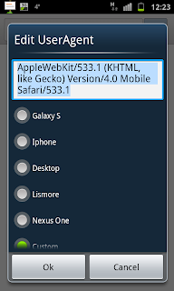 Browserul telefonului are o functie oarecum ascunsa (tasteaza in campul pentru adresa a browserului „about:useragent” fara ghilimele) care iti permite sa schimbi User Agent-ul (o chestie care-i spune paginii ce browser folosesti) si alegi dintr-o lista (Galaxy S, iPhone, Desktop, etc) sau scrii ce vrei tu.