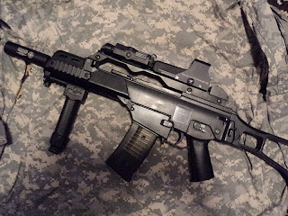 De curand am schimbat sina Picatinny de sub handgrip cu una mai lunga, pe care, in viitor planuiesc sa montez ori un AFG (Angled Fore-Grip) de la Magpul, ori un lansator de grenade de 40mm AG36, dar asta ramane de vazut. Pana acum am mai pus pe acea sina un SCAR Grip.