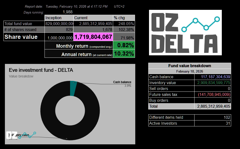 In ultima vreme am facut un pic de ratting invartind un Ishtar prin anomalii si un pic de explorare cu Astero, dar majoritatea banilor mei erau pe un caracter din Jita, si dupa ce-am facut un pic de burnout de la market trading, m-am decis sa risc un pic si sa investesc intr-un fond de investitii (da, exista si d-astea) unde am investit nici mai mult nici mai putin de 29,813,498,600 ISK, echivalentul a 20 de actiuni in fondul de investitii DELTA apartinand unui tip pe nume Oz, autointitulat eve online market guru and spreadsheet nerd. Tipul e foarte space-rich, destept, de incredere, si e actual membru CSM, lucrand impreuna cu developerii Eve Online pentru propasirea jocului.